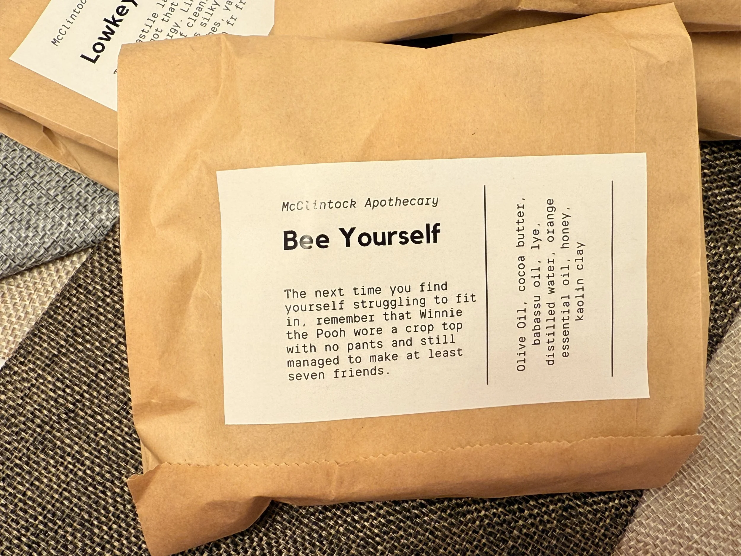 Olive oil, cocoa butter, babassu oil, lye, distilled water, orange essential oil, honey, kaolin clay