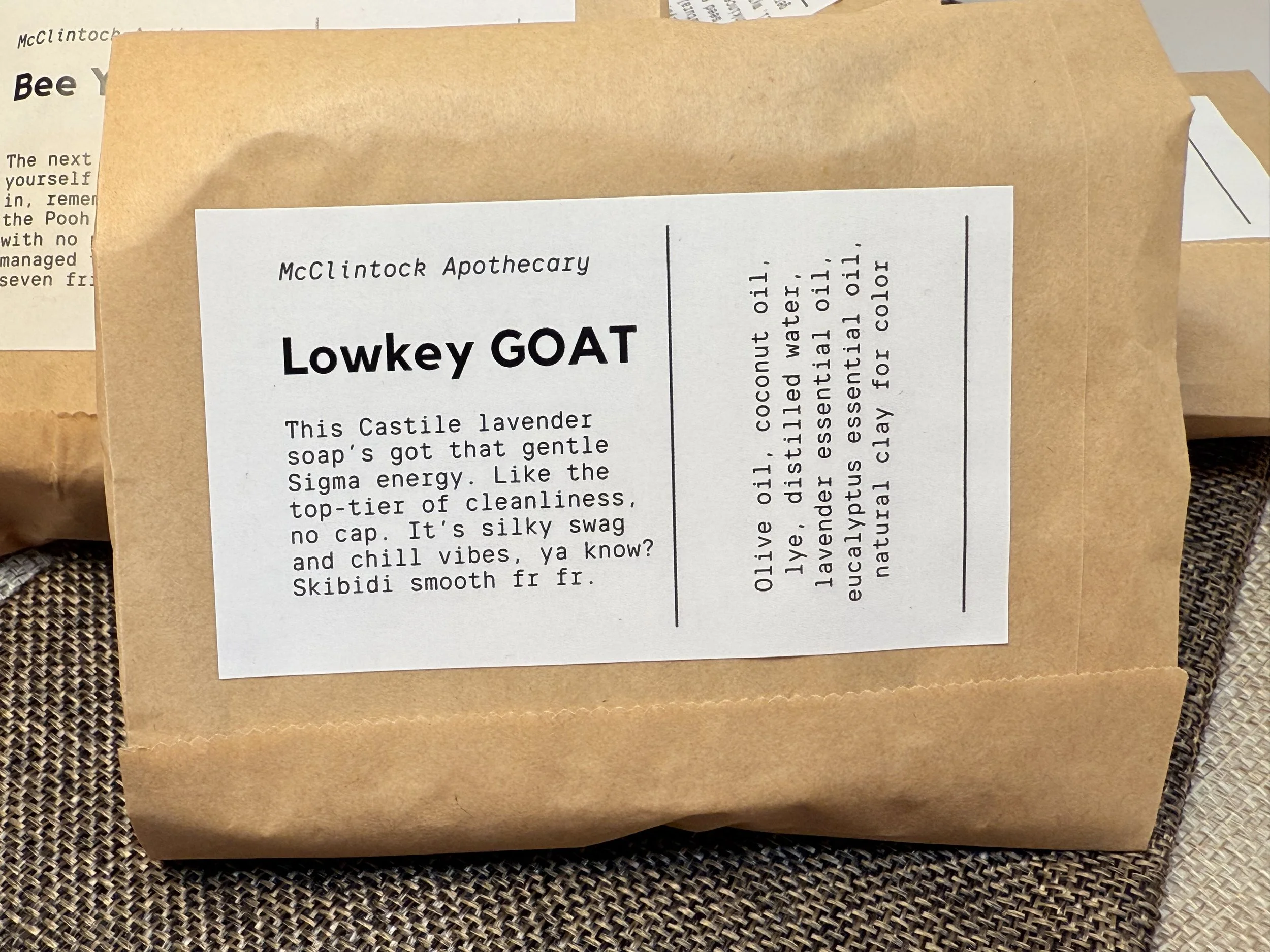 Olive oil, coconut oil, lye, distilled water, lavender essential oil, eucalyptus essential oil, natural clay for color